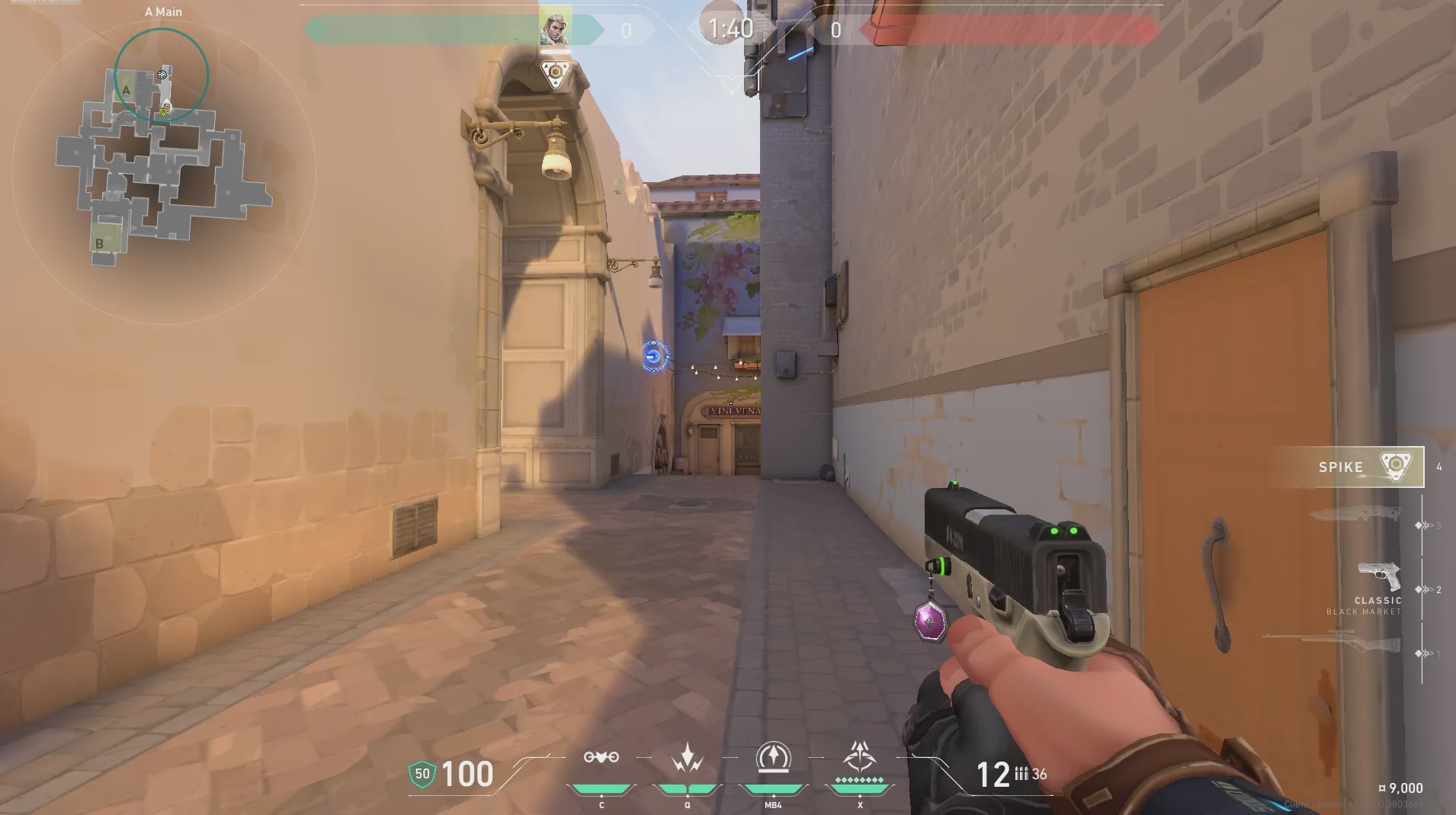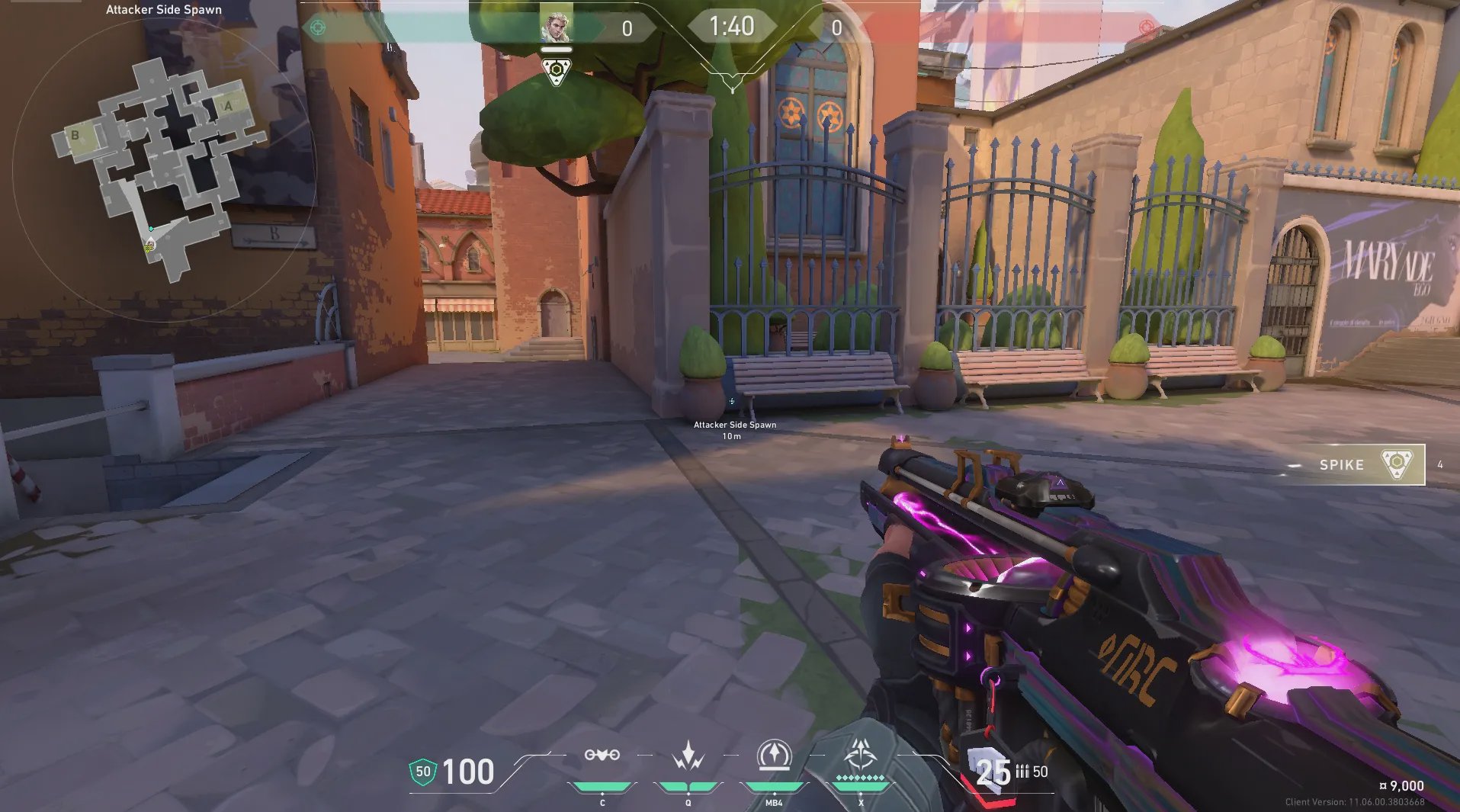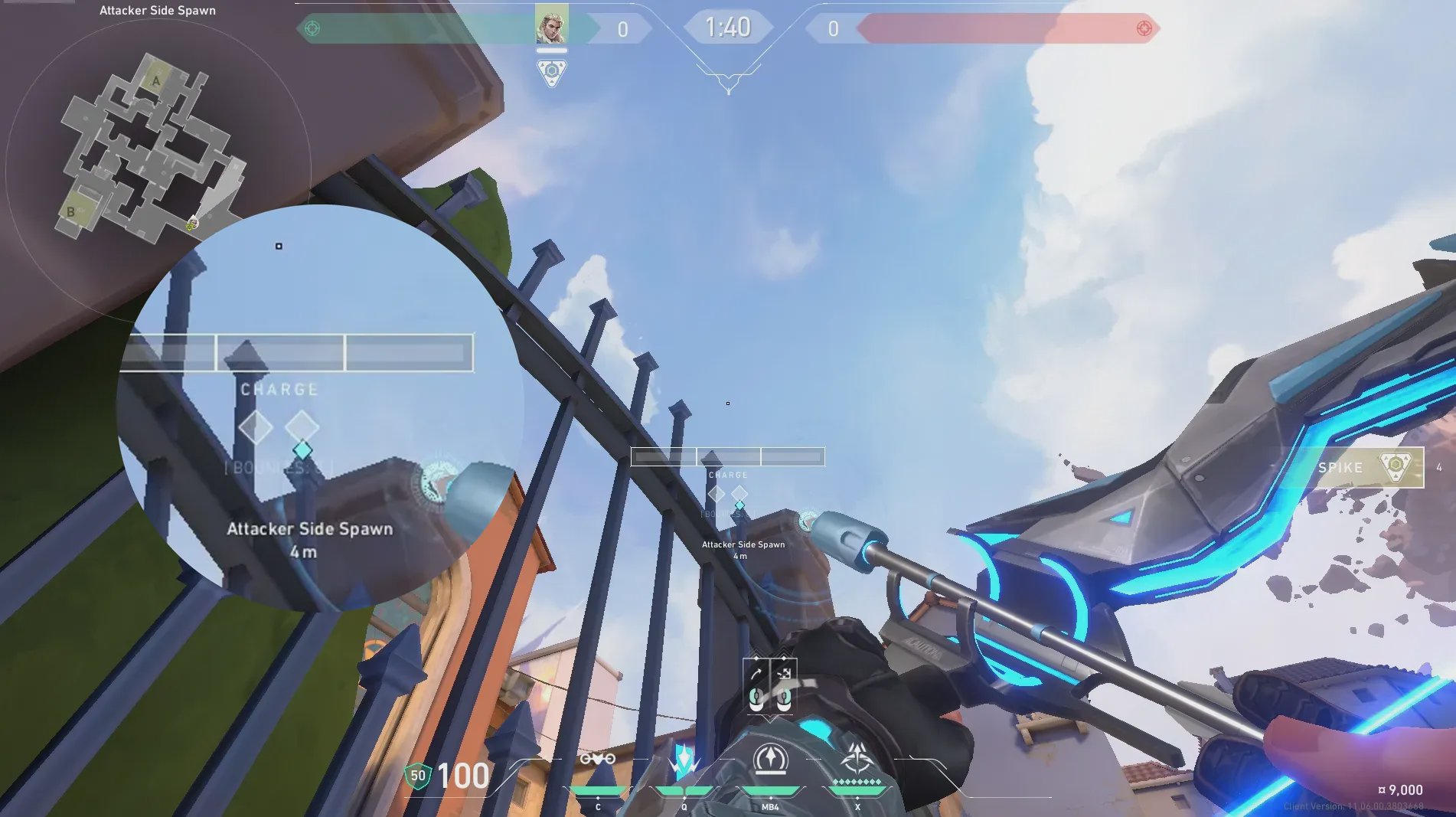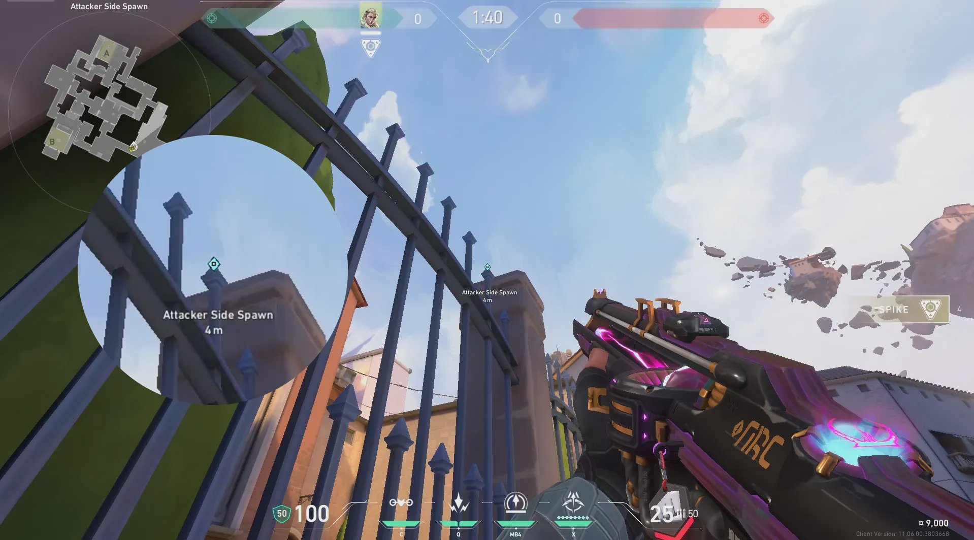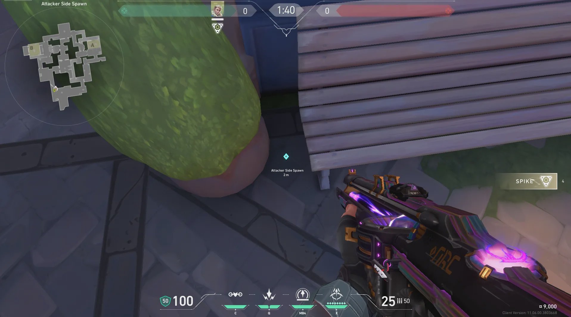 进攻方出生点出手,探测A酒桶位和周边信息。